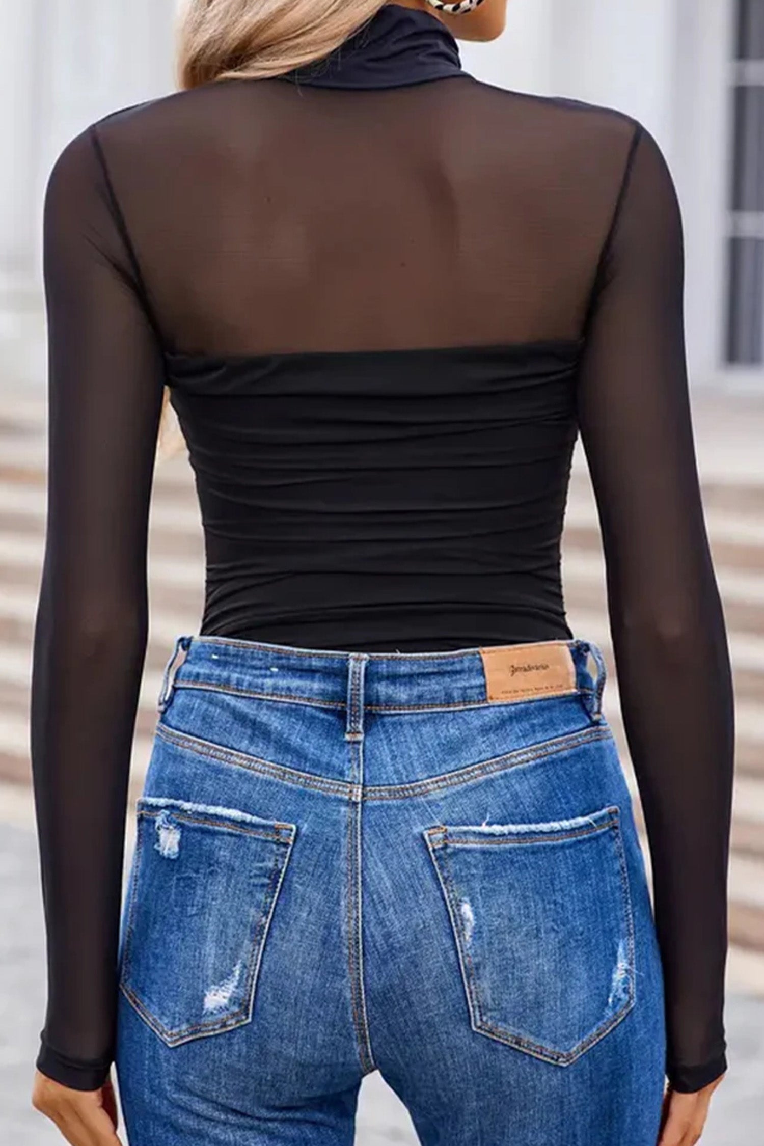 - Sheer mesh patchwork creates this women’s high neck top a trendy alluring look.